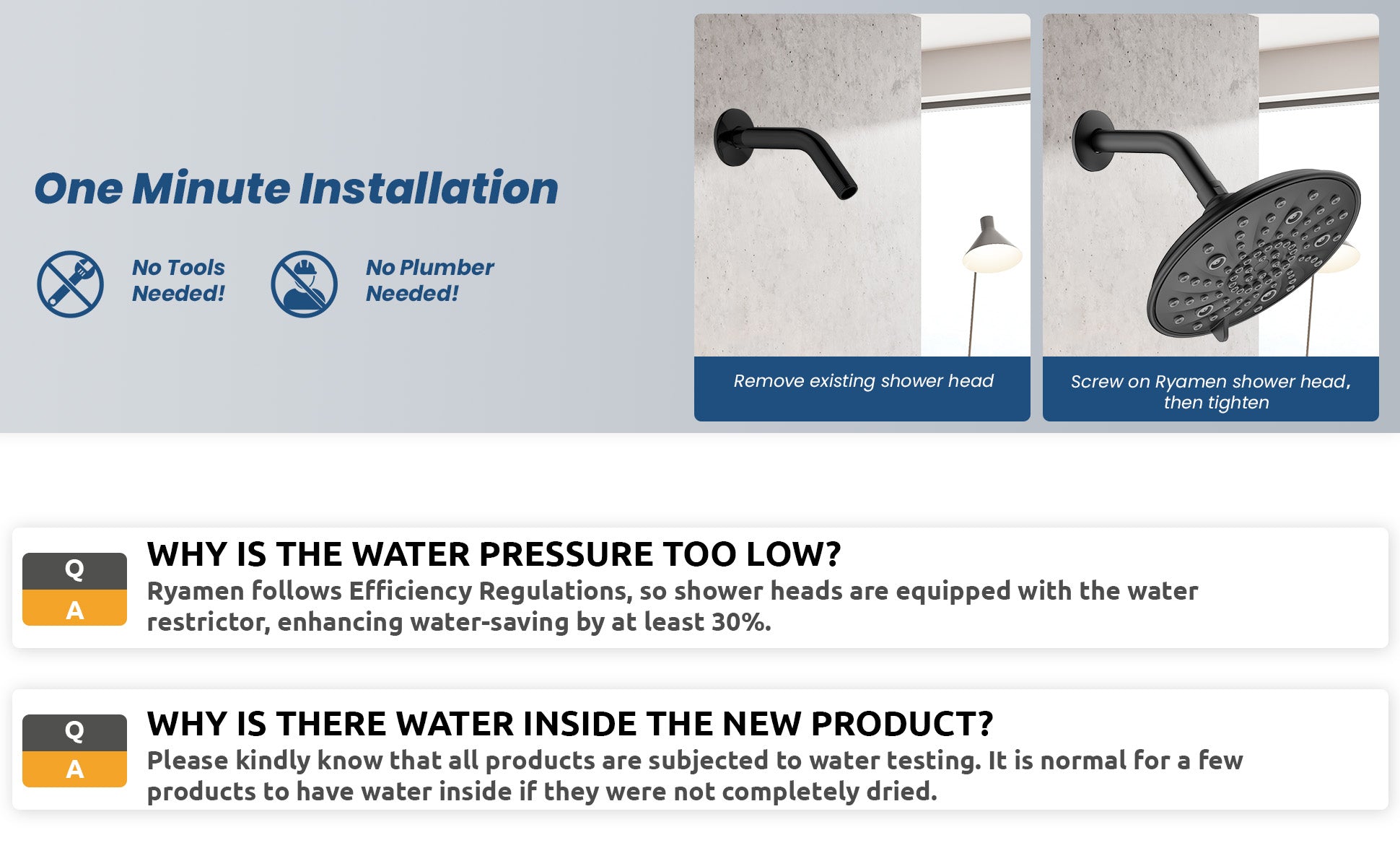 - 1-Min Installation:Just a twist, install in 10 seconds, with G 1/2 thread, no tools and plumber needed, package includes shower head(built-in filter), water filter, teflon tape, instruction manual. Tips: It's not recommended to use teflon tape unless there is a leakage after installation.