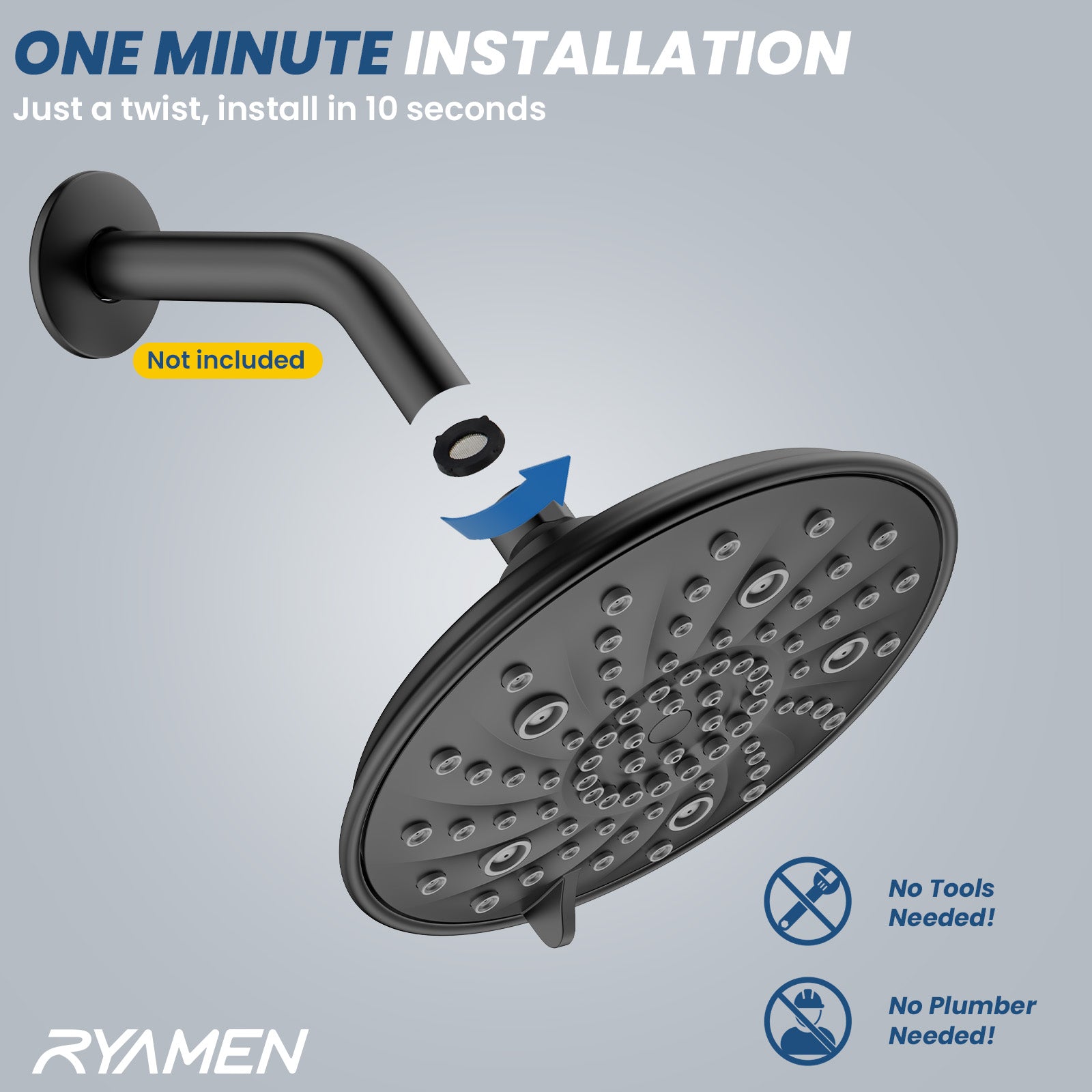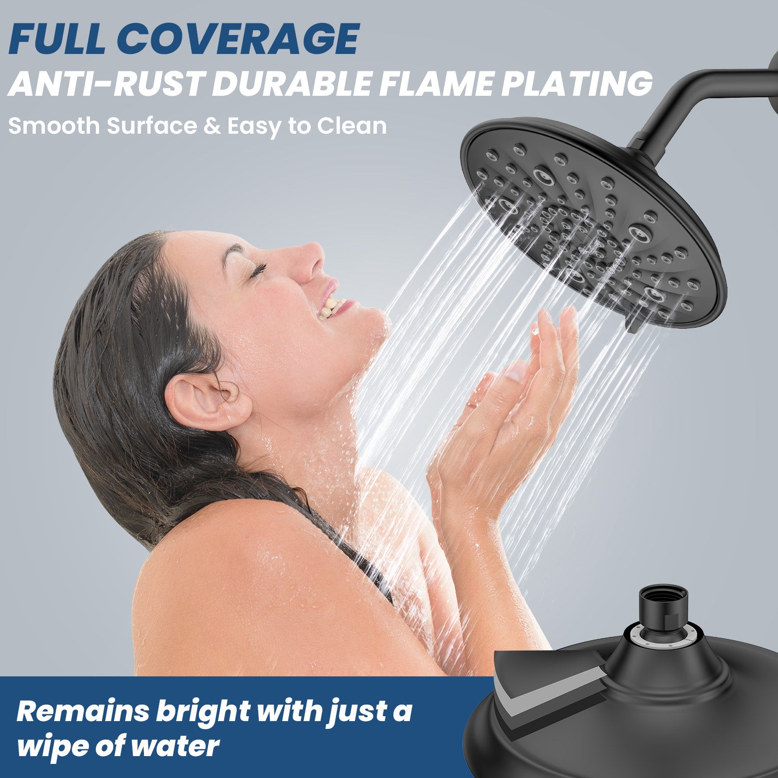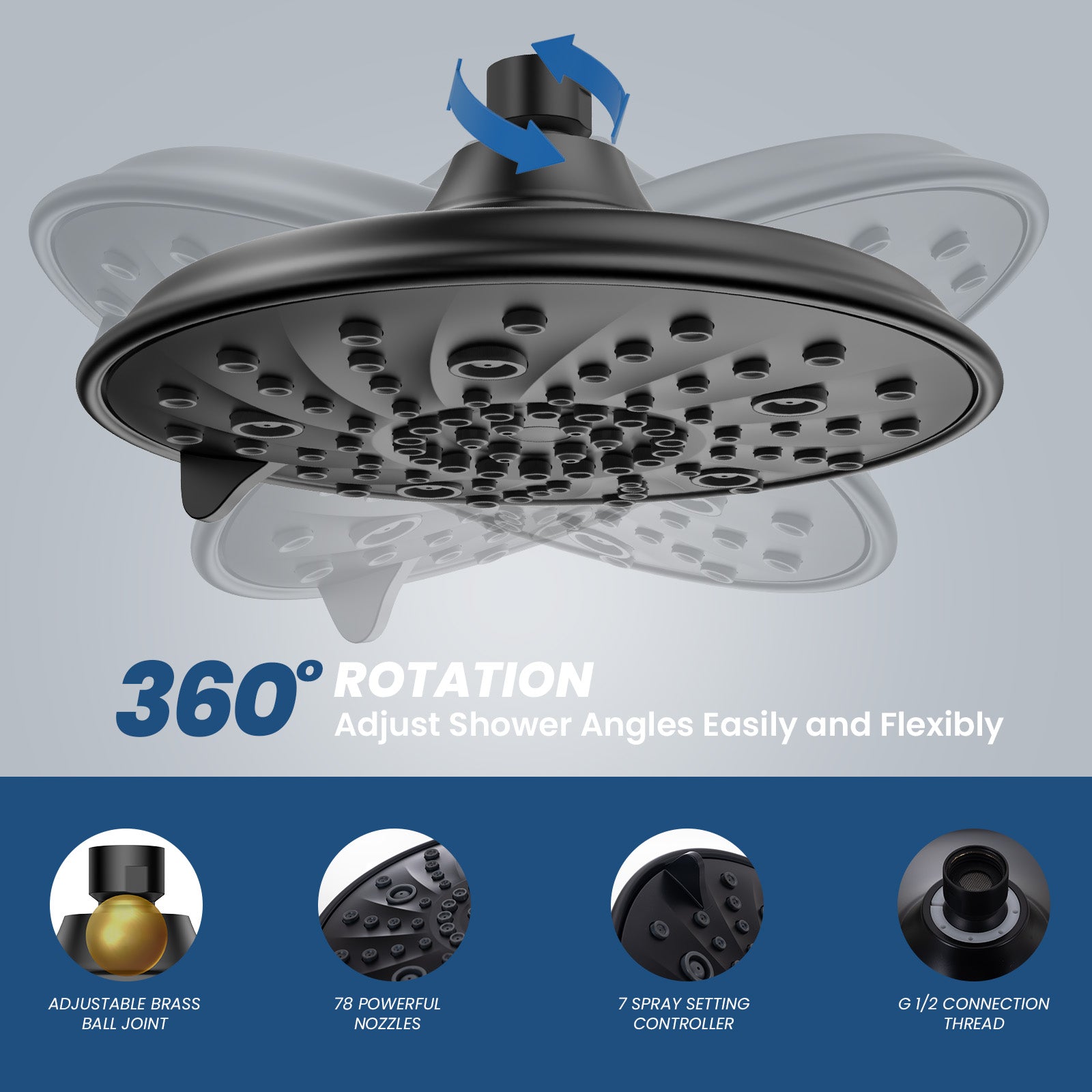 Shower Head 8-Inch, High Pressure Large Rain Shower Head with 7 Spray Settings, Fixed Shower Head with 1-Min Installation, Full Coverage Flame Plating, Easy to Clean, Black