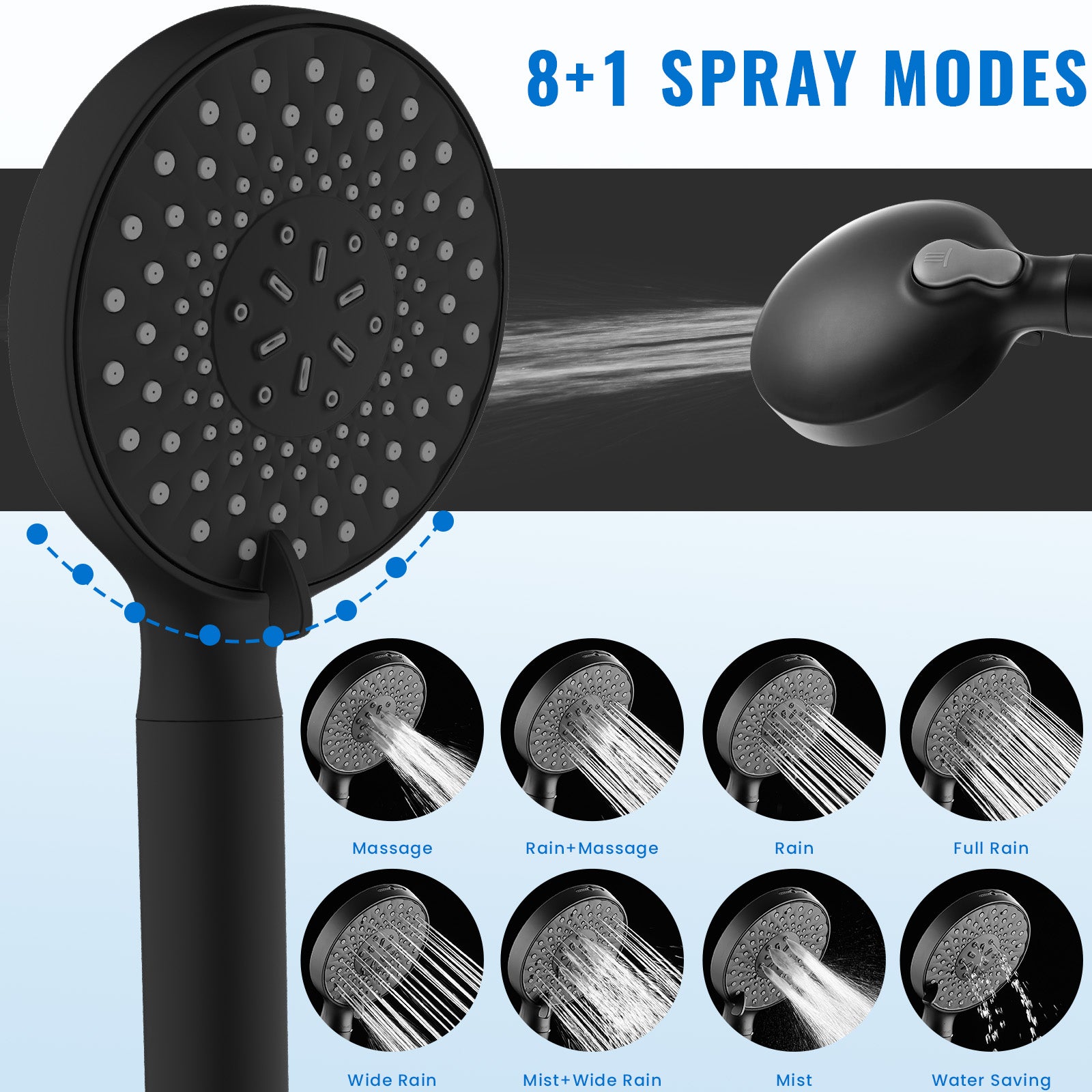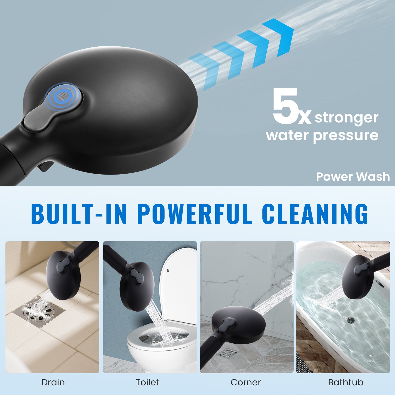- 【8 Spray Modes + Power Wash Mode】: Easily switch between 8 spray modes for a relaxing shower. For tough messes, the power wash mode delivers high pressure to clean your tub, tile and pet fur within 30 seconds, no scrubbing or bending needed