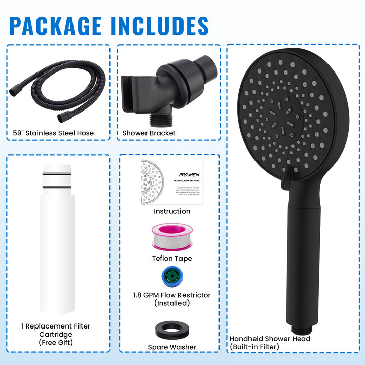 - 【3-Minutes Install and Tool Free】: Installs in just 3 minutes with no plumber or tools needed. Fits standard G1/2 thread. package includes handheld shower head ( built in filter ), 59" stainless steel hose, shower bracket, rubber washer spare, anti-leakage Teflon tape and installation guide. If you have any questions, please feel free to contact us through Amazon - we are here to help you within 24 hours