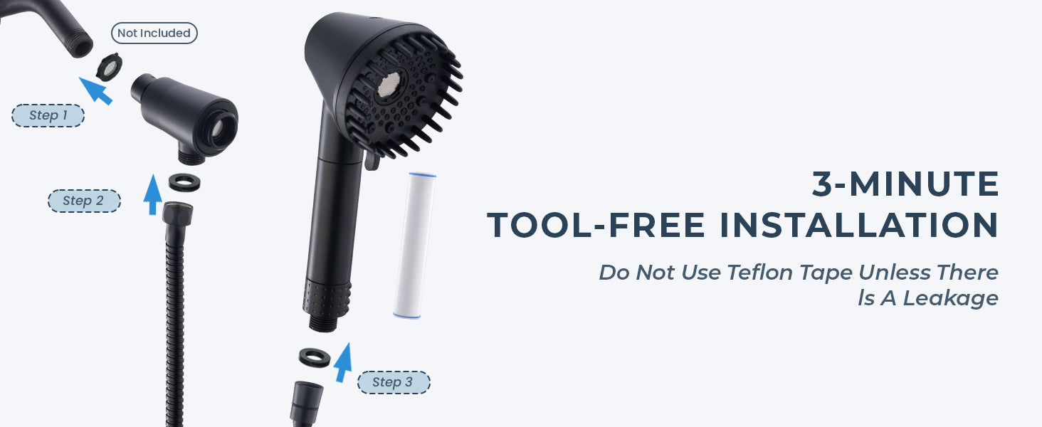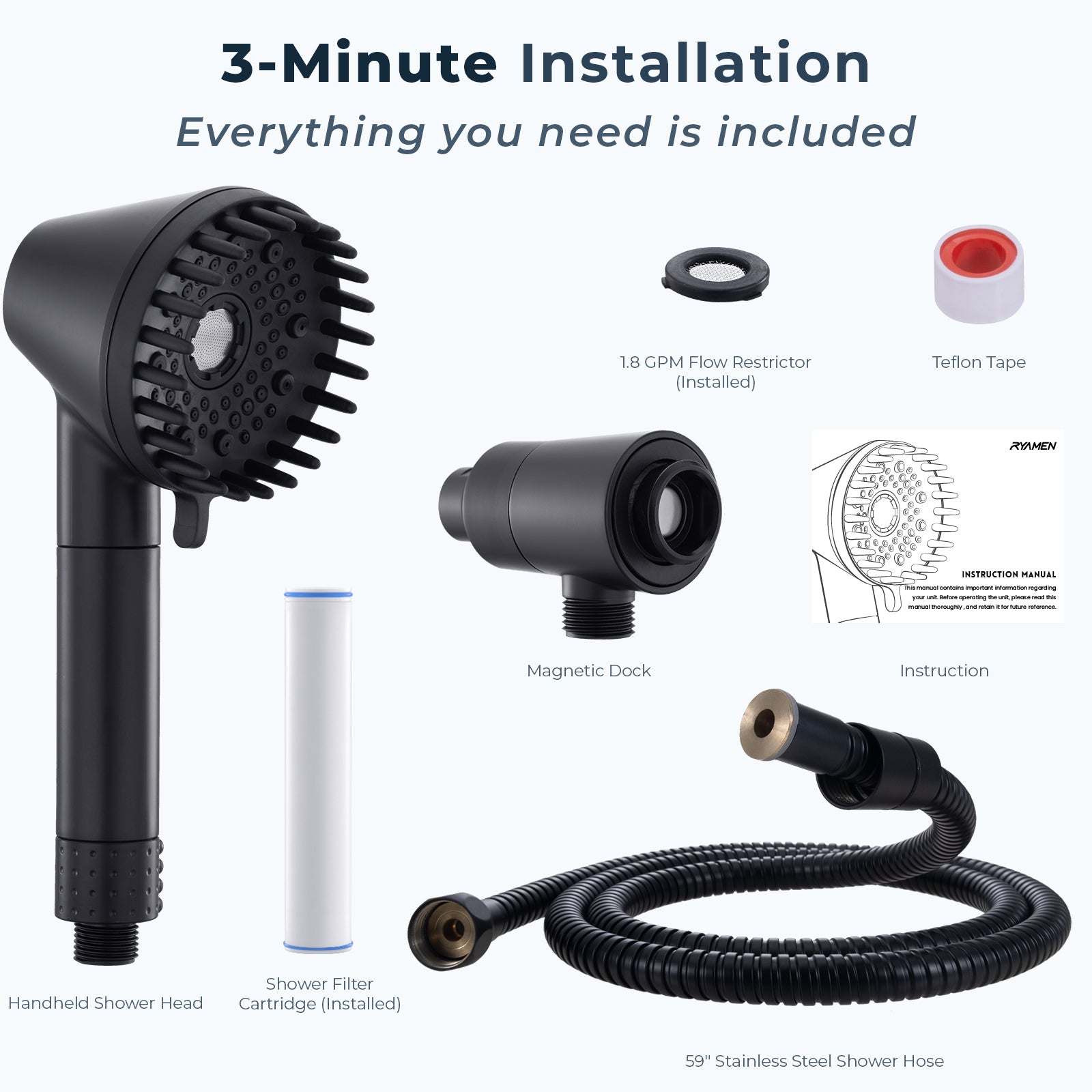 - Tool-Free Installation: Installs your Ryamen showerhead in under 3 minutes with no tools required. Package includes a shower head with filter, magnetic dock, 59-inch stainless steel hose, Teflon tape, and user manual—everything you need for a quick upgrade.