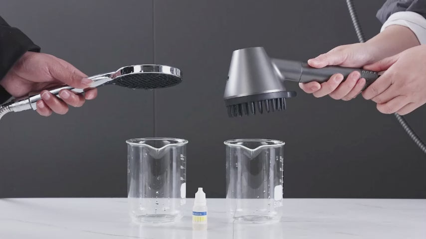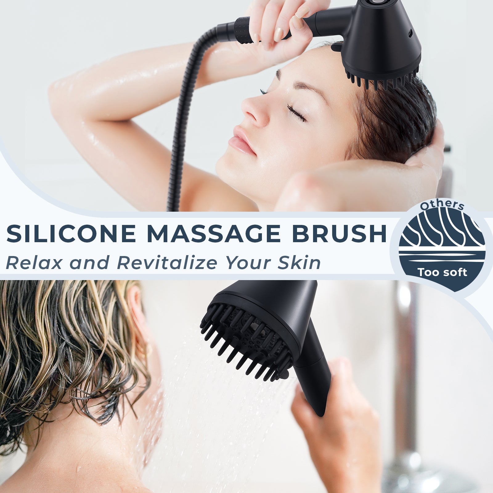 - Built-In Firm Massage Brush for Relaxation: The firm massage brush integrated on the shower face provides a spa-like massage experience. When paired with Massage Mode, it effectively stimulate the scalp, shoulders, and body, helping to relieve tension and promote relaxation—different from ultra-soft brushes on the market.