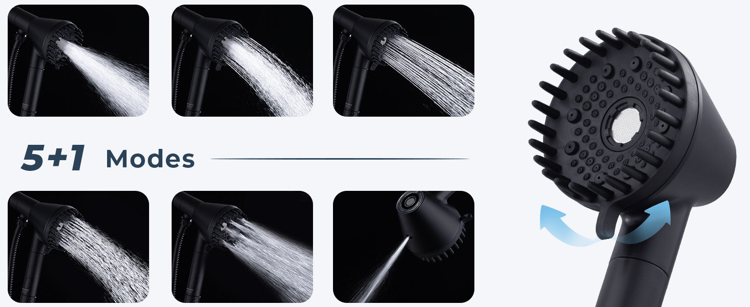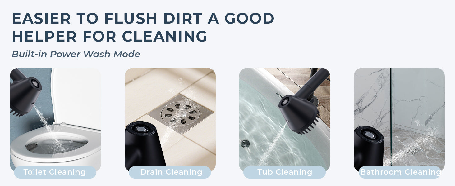 - 6 Spray Modes Including Power Wash: Massage, wide stream, rainfall, fixed, mist, and power wash. Switch freely to match your preference. The Power Wash Mode delivers concentrated high-pressure flow, making it easy to clean bathroom corners, bathtubs, toilets, and other hard-to-reach areas.