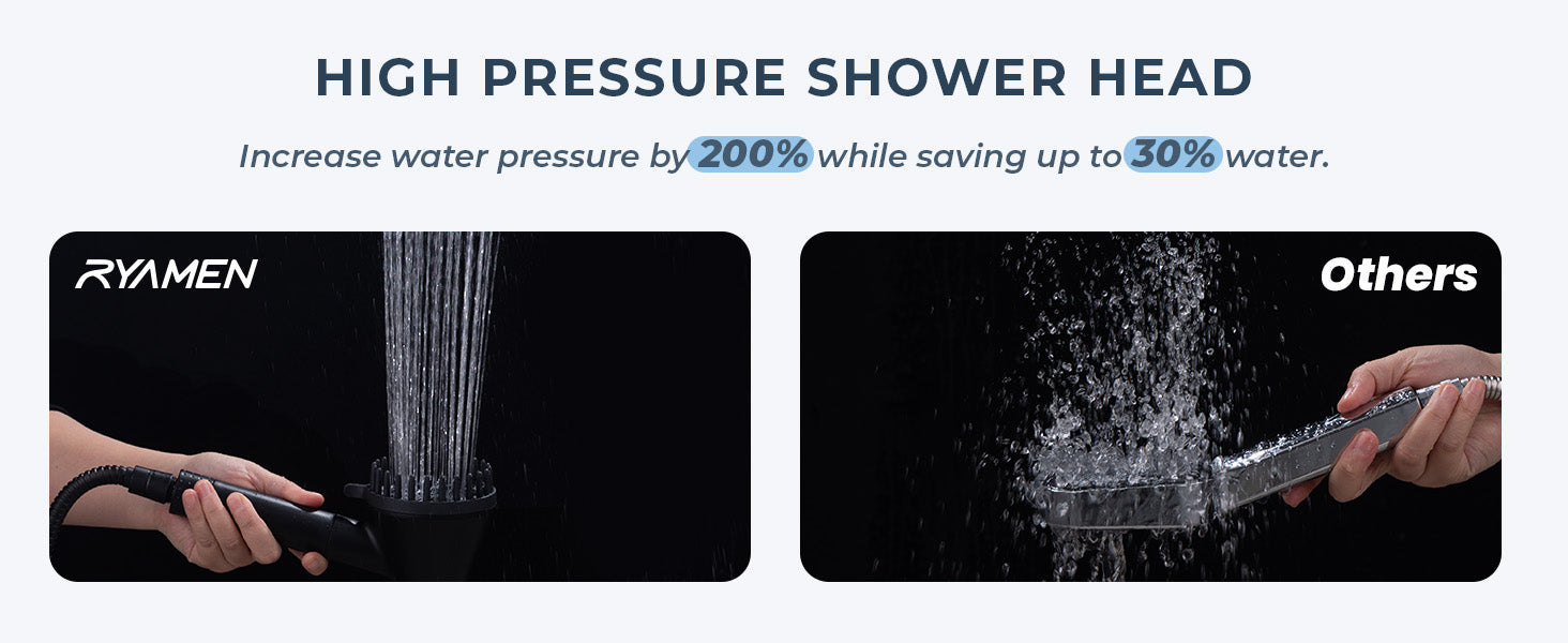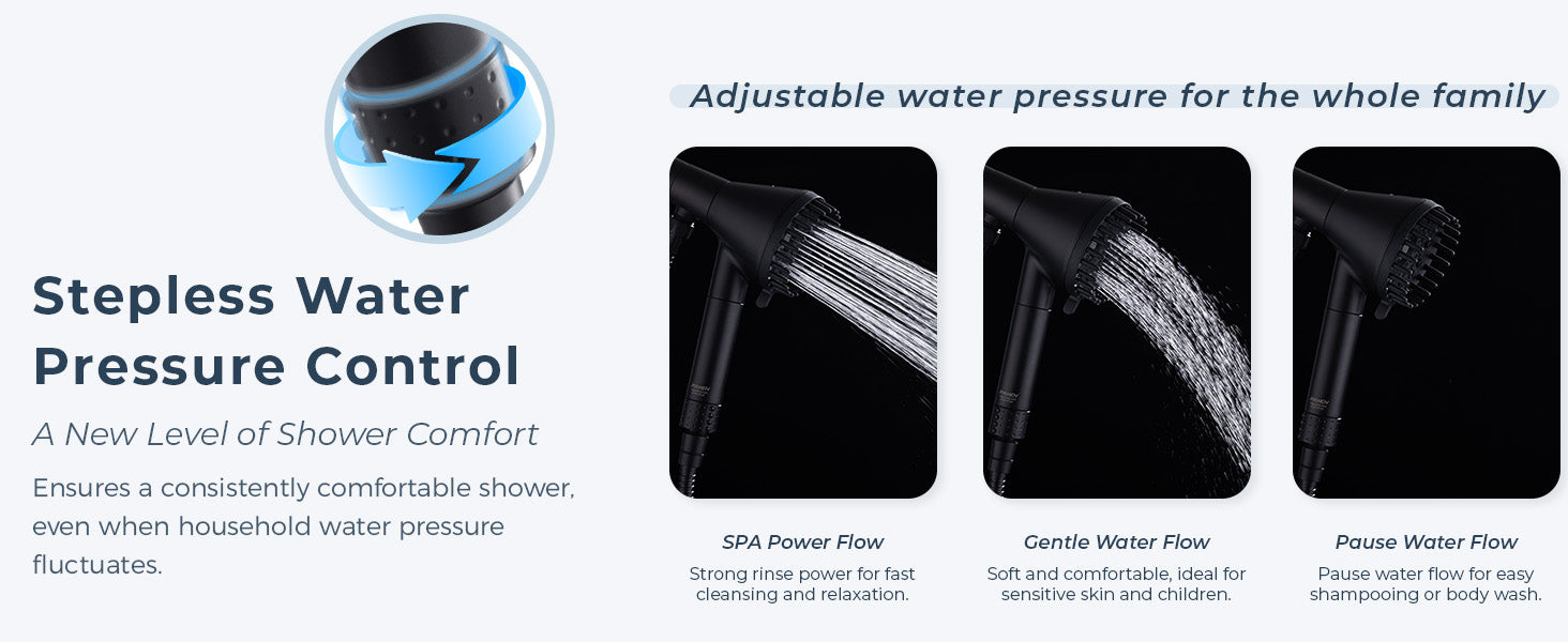 - High Pressure Shower Head & One-Touch Pause Control: Designed with pressure-boosting technology, ideal for low water pressure homes. Water flow is fully adjustable, and the one-touch pause button allows you to stop water instantly while shampooing or shaving—helping conserve water without changing the valve.