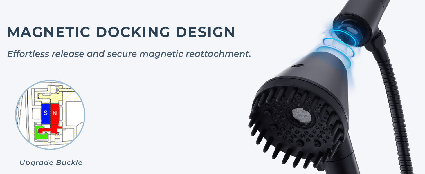 - Strong Magnetic Docking – Easy Reach & Secure Hold: Upgraded strong magnetic buckle design allows handheld shower head easy release and secure reattachment—even with wet hands or eyes closed. Ideal for bathrooms with higher shower outlets and perfect for shorter users, women, kids, seniors, and wheelchair users, with no worry of slipping or falling.