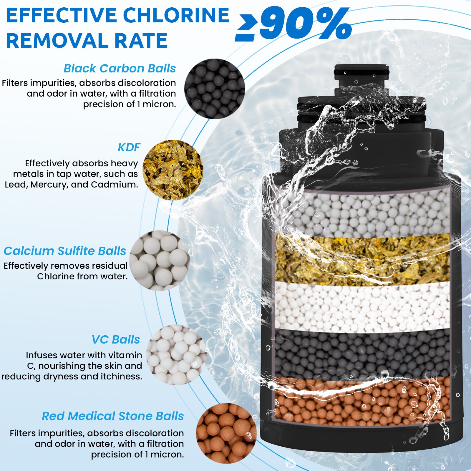 - What's Included: KDF, red medical stone balls, black carbon balls, calcium sulfite balls, and vitamin C (VC) balls. These components help absorb heavy metals, effectively remove residual chlorine, infuse the water with vitamin C, and nourish the skin, reducing dryness and itchiness.