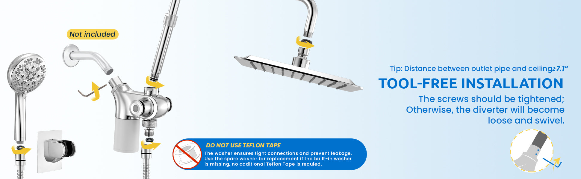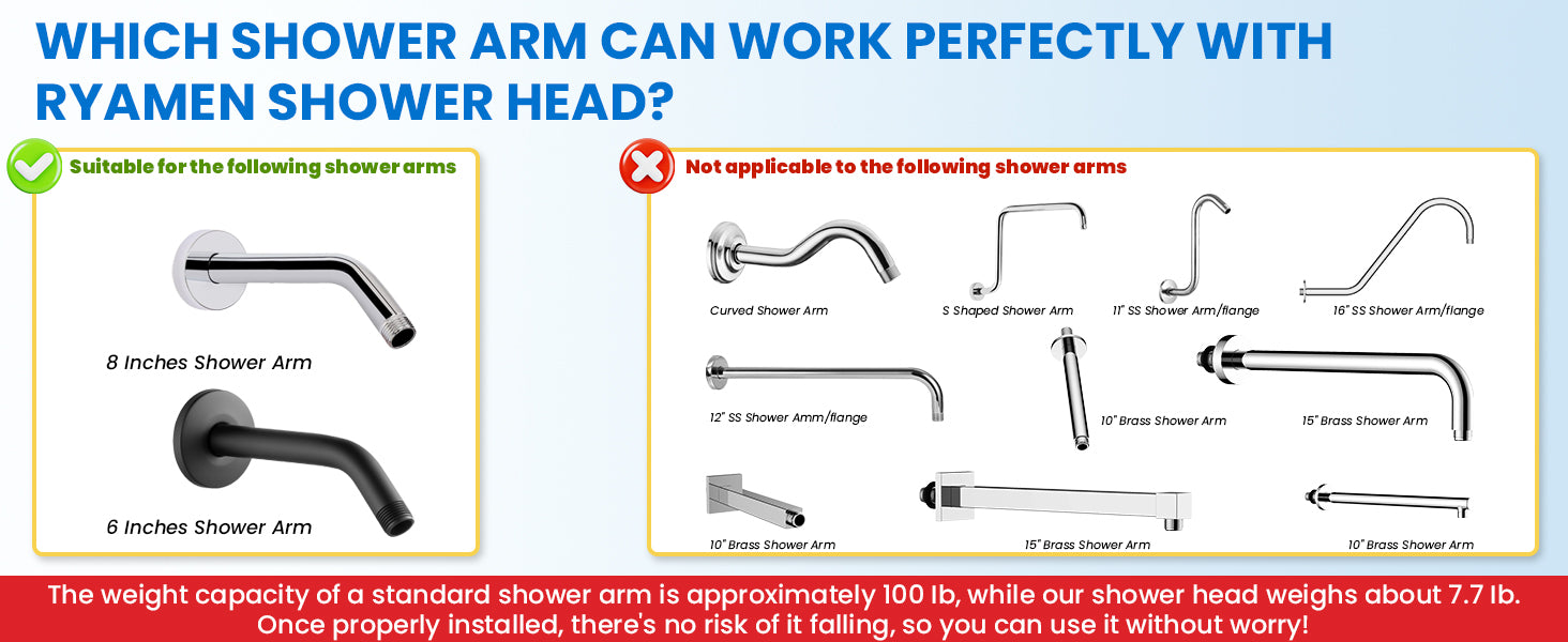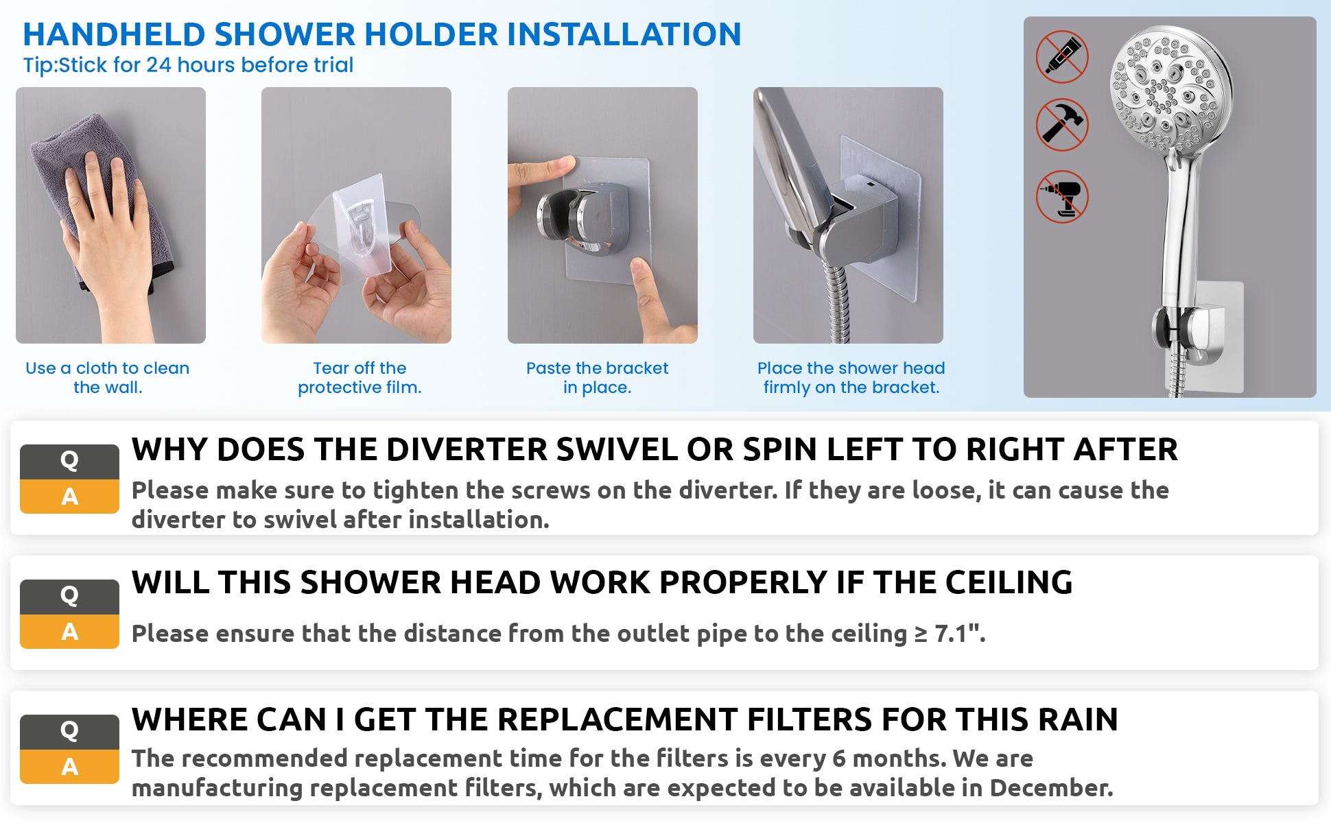 · Easy Installation: Package includes 10" rainfall shower head, L-shaped shower column, 3-way diverter with filter cartridge, sealing cover, handheld shower head and holder, 59" hose, water filter, hex key, spare washers and screws, instruction manual, you can watch the installation video, no plumber needed. Please ensure that the distance from the outlet pipe to the ceiling ≥ 7.1"