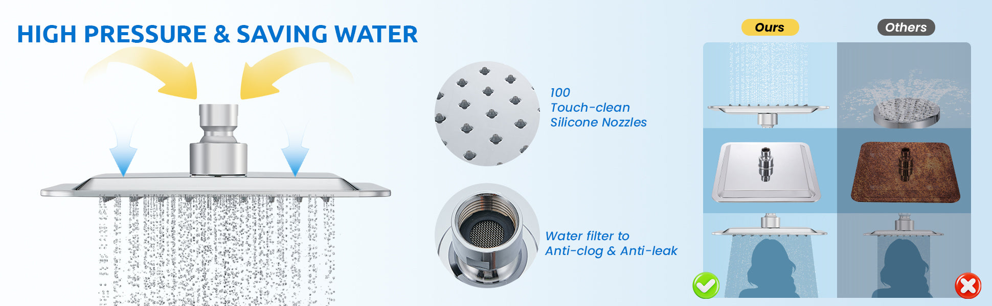 · 10" Height-Adjustable Rain Shower Head: This large rain shower head offers full-body coverage, delivering a luxurious shower experience. The brass swivel ball connector allows you to adjust the shower head to any angle. With an adjustable slide bar, the height of the rain shower head can be easily customized, making it perfect for children, women, and men