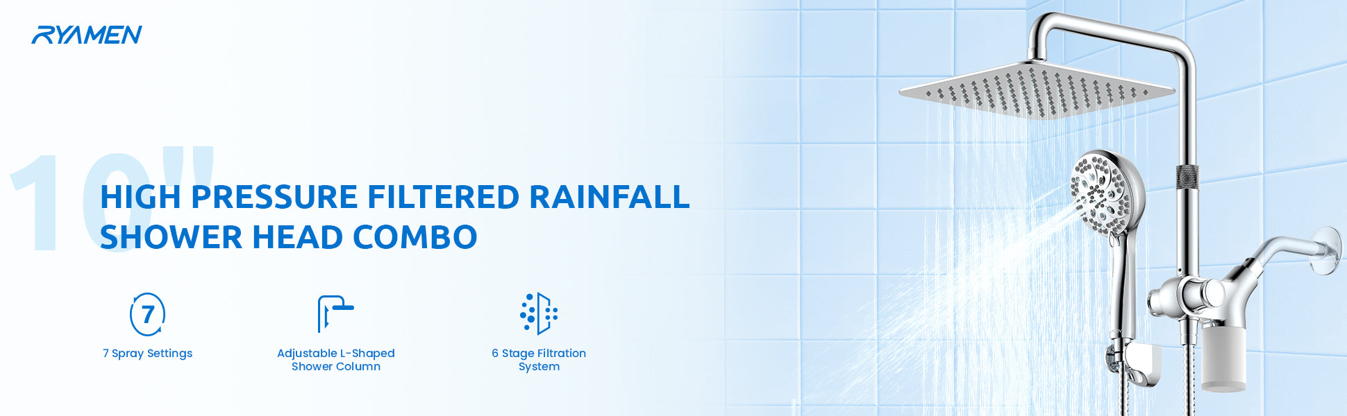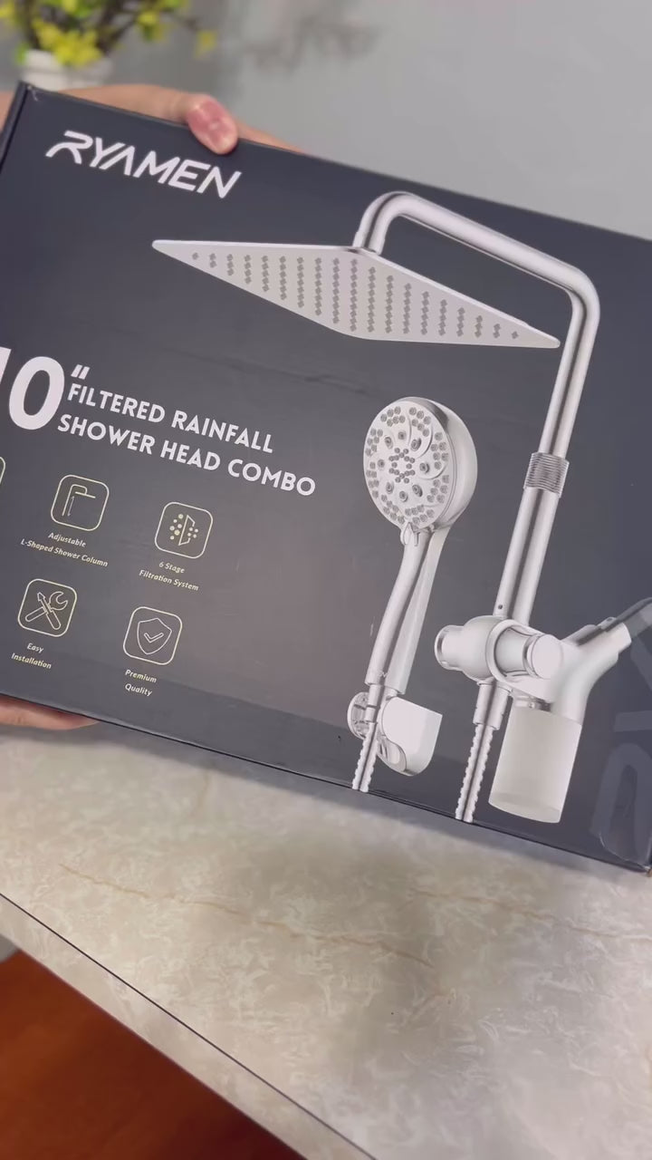 10-Inch RYAMEN Upgraded Dual Shower Heads Combo, 10 inch Filtered Shower Head with Handheld, 3-Way Rain Shower Head with Filters 2.5 GPM (Except California), 7 Settings Handheld Spray, High Pressure, Height Adjustable (Black)/(Chrome Silver)