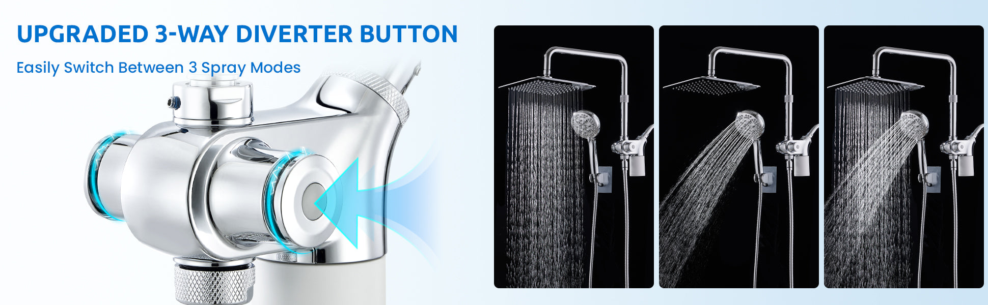 · Upgraded 3-Way Diverter Valve: Easily switch between 3 shower modes with the upgraded button that has passed 250,000 rigorous push tests, enhancing its lifespan. Choose between rain shower head, handheld shower head, or dual shower heads to meet the needs of every family member