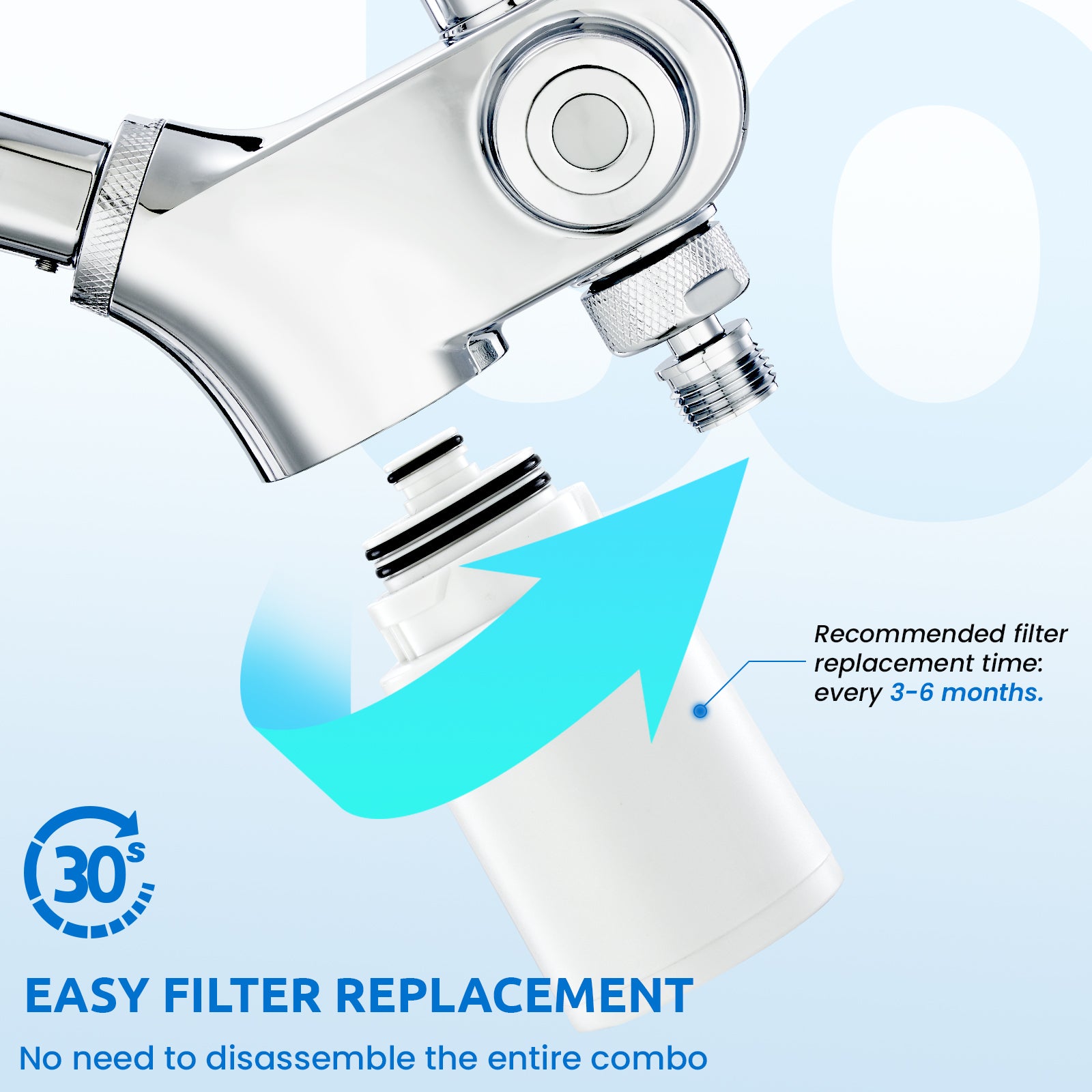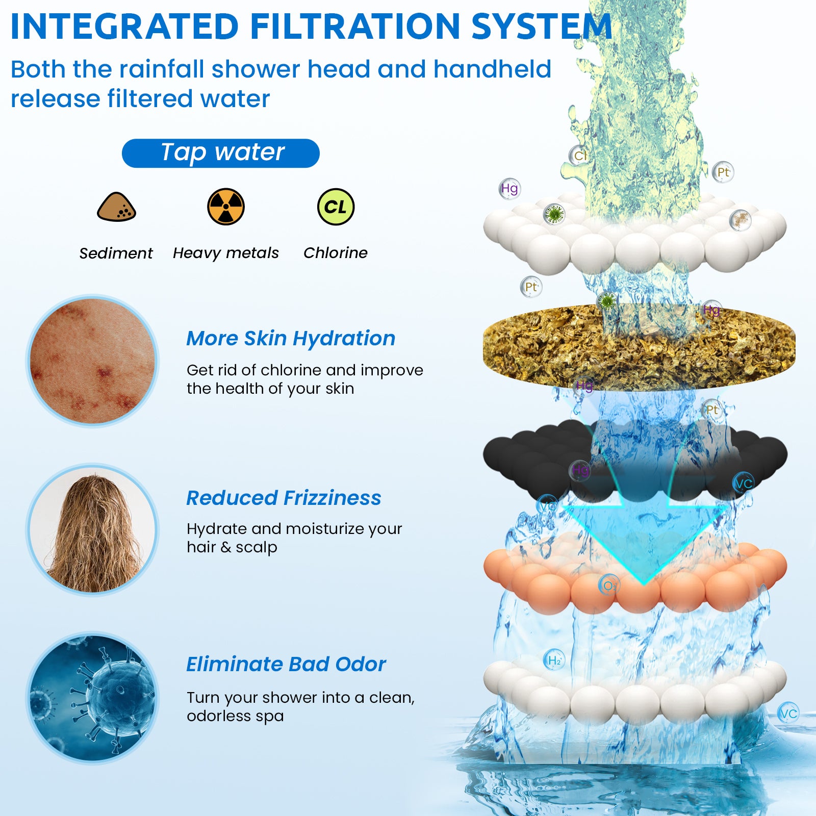 · Integrated Filtered System: Both rain shower head and handheld shower head can release filtered water, blending KDF-55 technology with VC Balls, Calcium Sulfite Balls, Carbon Balls and McFee Stone Balls, help remove the sediment, heavy metal and chlorine in the tap water, providing your family healthier and cleaner water. Easy to replace filter cartridge, no need to disassemble the entire dual shower head combo